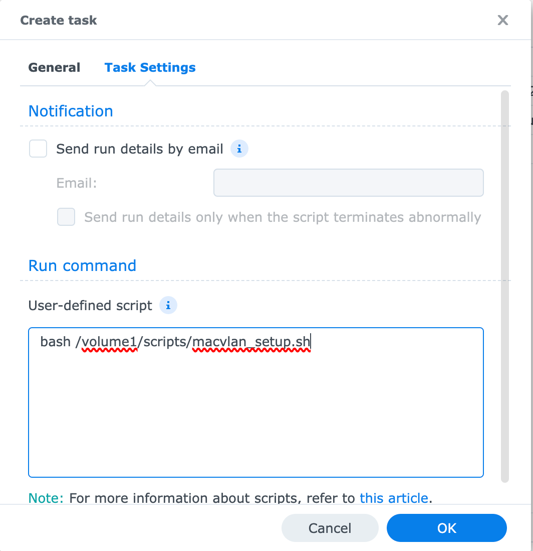 Po restartu NAS je potřeba macvlan0 interface znovu vytvořit. Ideální je k tomu Task Scheduler. Nejprve je potřeba vytvořit script soubor s obsahem: